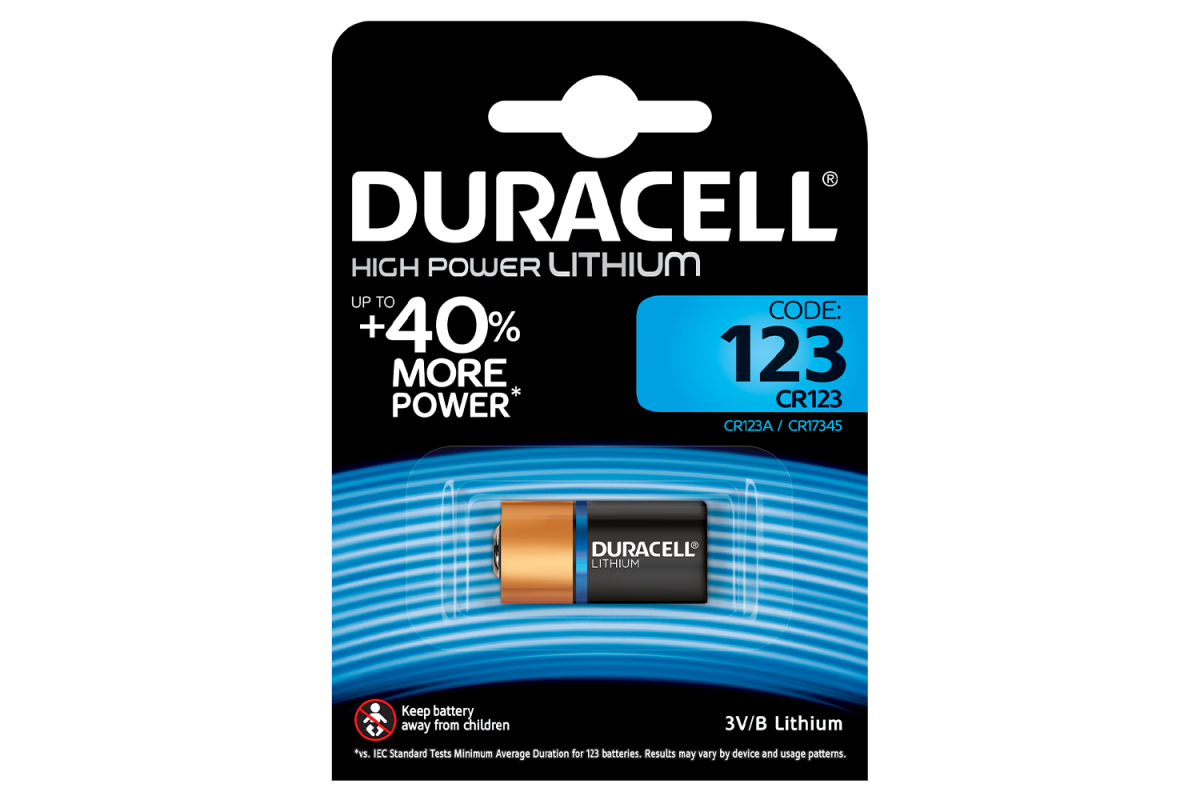 Литиевые батарейки Duracell High Power 123 изготовлены из высокочистого лития, благодаря чему они дают до 40% больше энергии для питания Ваших интеллектуальных домашних устройств (датчики, бесключевые замки, детекторы дыма), фотовспышек, фонарей, аксессуаров для велосипедов и электронных собачьих ошейников.