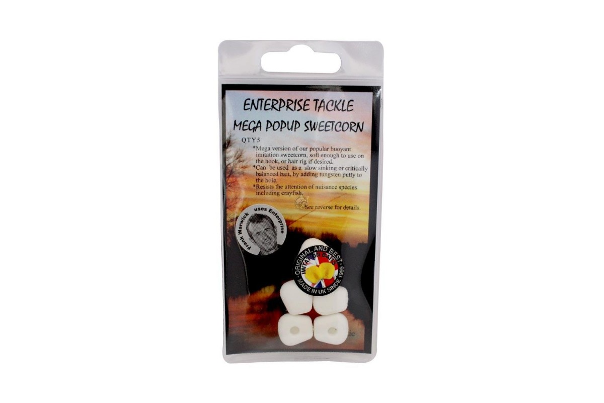 - Mega Popup Sweetcorn White - экстра большая искусственная плавающая кукуруза белого цвета без аромата. Эта кукуруза устойчива против назойливых раков.