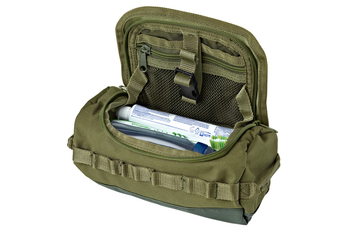 Сумка позволяет хранить все предметы для умывания и ухода в одном месте. Она оснащена внутренними отделениями на молнии и внешними ремнями для дополнительных возможностей хранения, а также имеет просторное центральное отделение для хранения всего необходимого для ухода.